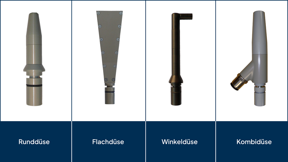 - Flachdüse: Sie verteilt die Energie auf eine breitere Spur und sorgt auf grossen, ebenen Flächen für gleichmässige, sanfte Übergänge. Die Punktleistung sinkt, die Flächenleistung steigt.